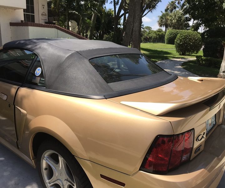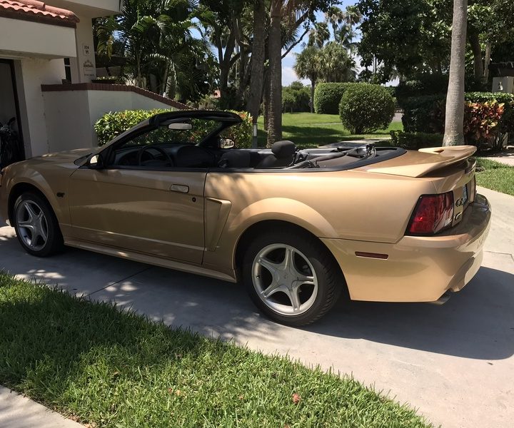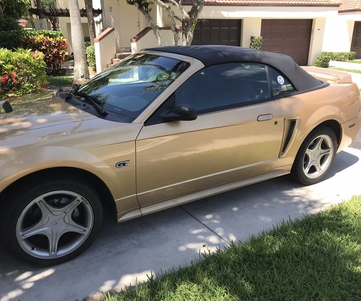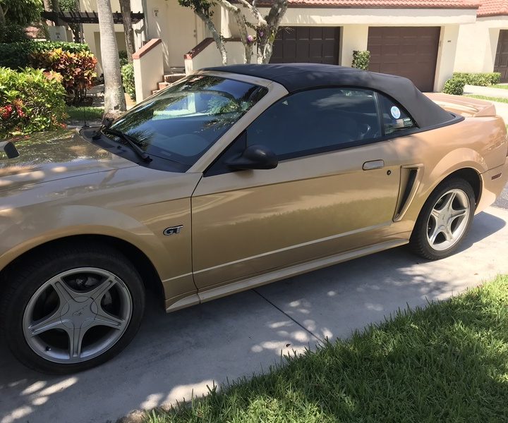 2000 Mustang GT Convertible, 4.6L V8, 97K miles, Sunburst Gold exterior paint, black cloth interior, automatic transmission, power top, power steering, power front disc brakes, power windows, power door locks, AM/FM, console, factory A/C. Located in Florida.